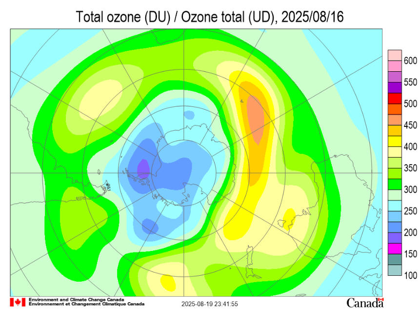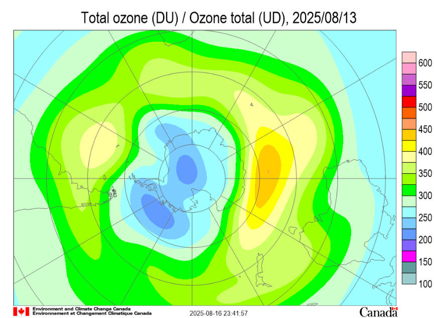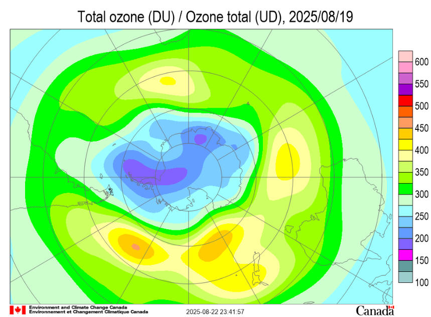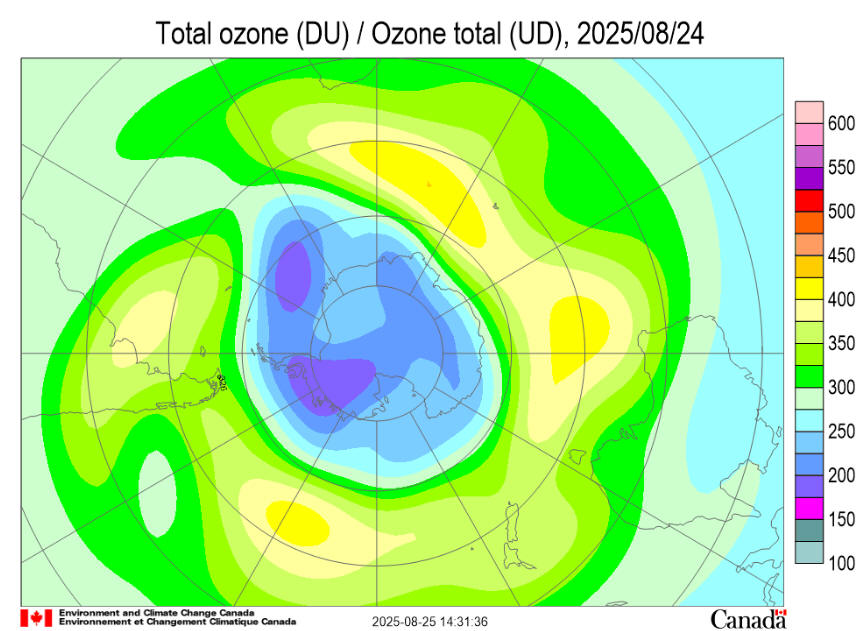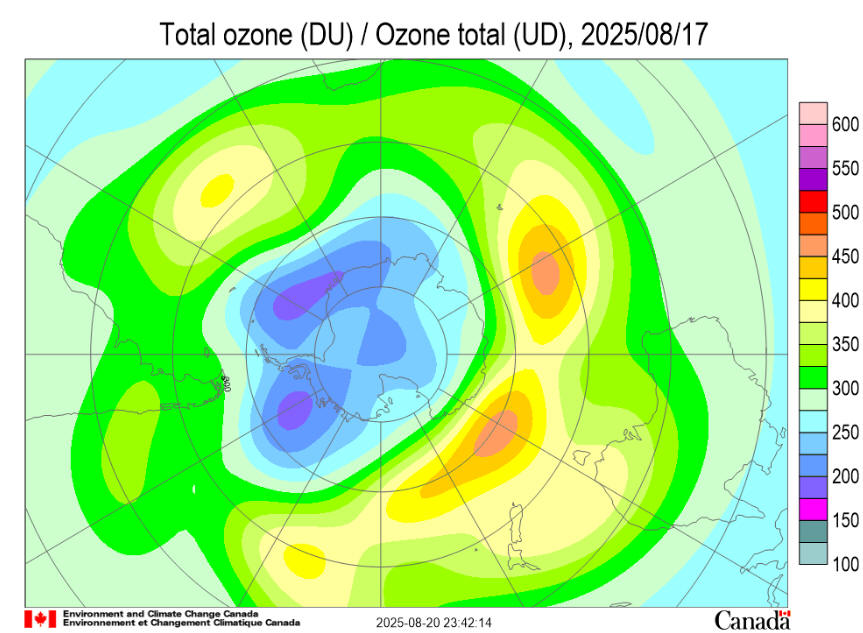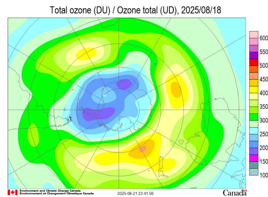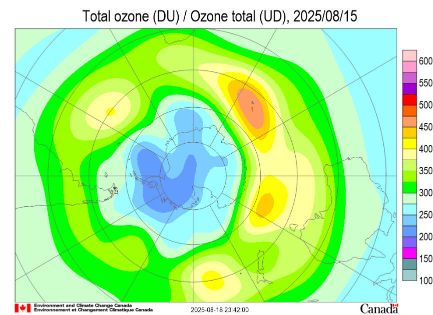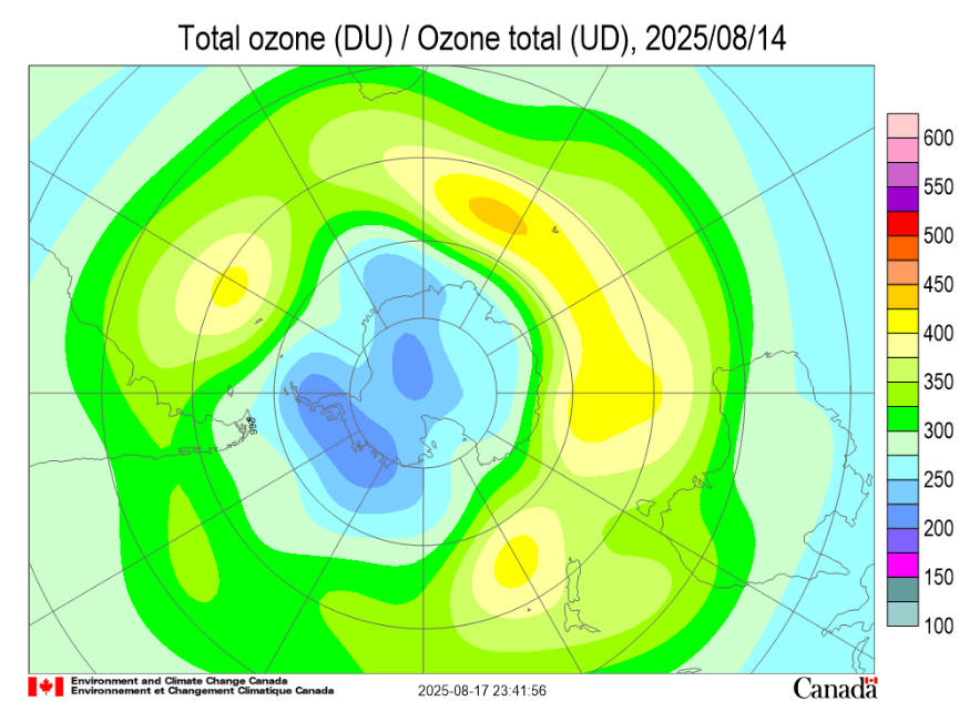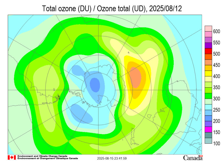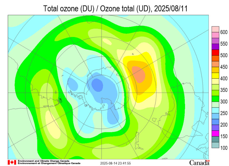 The total ozone maps are based on ground-based measurements available from the World Ozone and Ultraviolet Radiation Data Centre. Preliminary near real-time data from ground-based observations were also used for the most recent maps. Total ozone values are given in Dobson Units. The numbers represent observations taken from ground stations situated at the bottom left corner of the number. The World Ozone and Ultraviolet Radiation Data Centre (WOUDC) is one of six World Data Centres which are part of the Global Atmosphere Watch programme of the World Meteorological Organization. The WOUDC data centre is operated by the Meteorological Service of Canada, a branch of Environment and Climate Change Canada. Ozone data set categories include total column ozone and vertical profile data from lidar measurements, ozonesonde flights, and the Umkehr technique. Ultraviolet (UV) radiation data set categories include broadband, multiband, and high resolution spectral data types. Maps of deviations represent total ozone deviations from the 1978-1988 level estimated using Total Ozone Mapping Spectrometer (TOMS) data for all areas except the Antarctic and from the pre-1980 level estimated using Dobson data over the Antarctic. Over areas with poor data coverage adjustments are made according to TOMS on Nimbus-7, Meteor-3, ADEOS and Earth Probe satellites. Over the polar night area Dobson and Brewer moon observations and/or NOAA's TIROS Operational Vertical Sounder (TOVS) satellite data are used. TOVS data are also used when the more reliable TOMS data are not available. The mapping algorithm is similar to those used by the WMO Ozone Mapping Centre. |