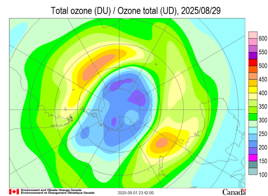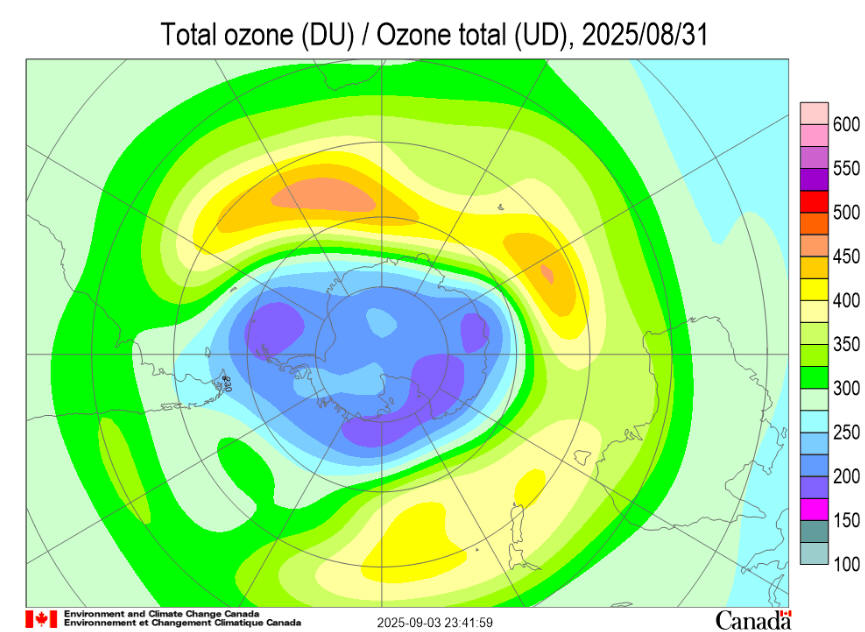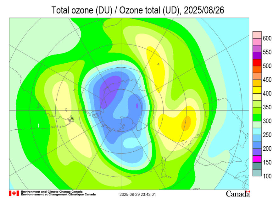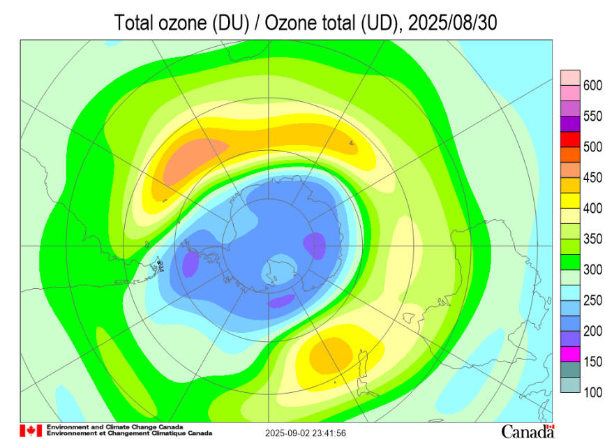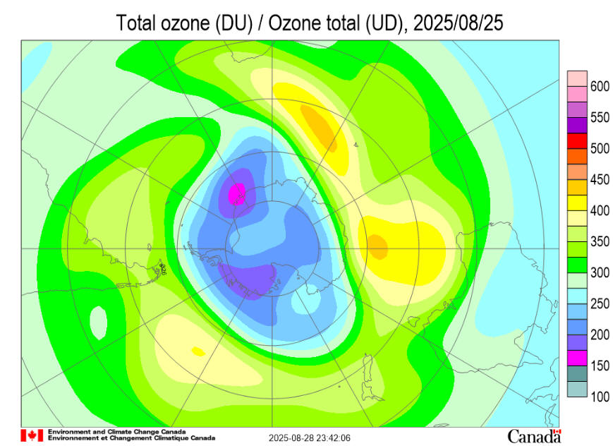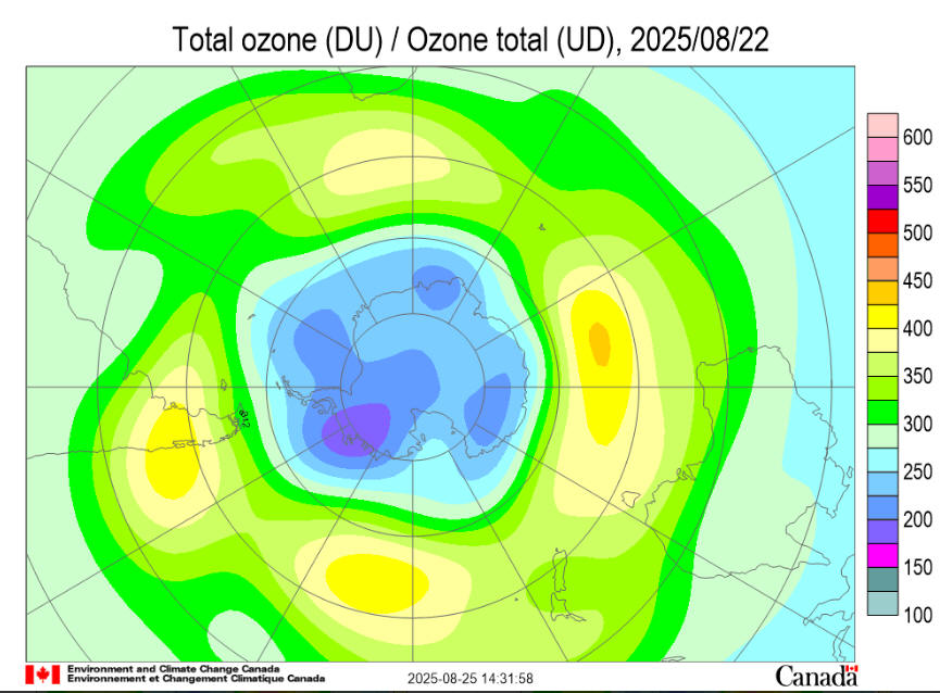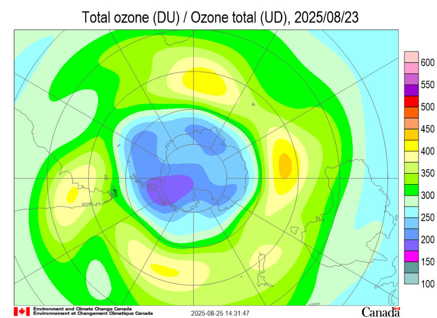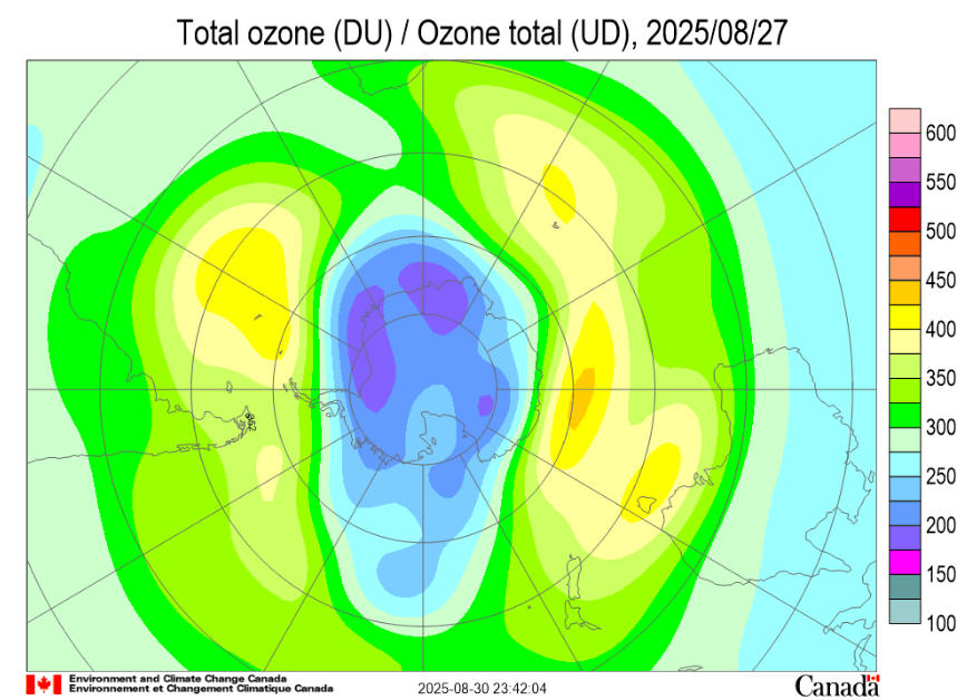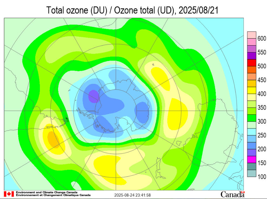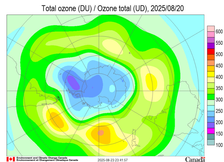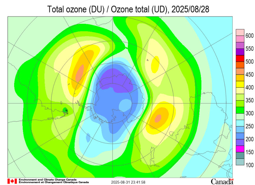 The total ozone maps are based on ground-based measurements available from the World Ozone and Ultraviolet Radiation Data Centre. Preliminary near real-time data from ground-based observations were also used for the most recent maps. Total ozone values are given in Dobson Units. The numbers represent observations taken from ground stations situated at the bottom left corner of the number. The World Ozone and Ultraviolet Radiation Data Centre (WOUDC) is one of six World Data Centres which are part of the Global Atmosphere Watch programme of the World Meteorological Organization. The WOUDC data centre is operated by the Meteorological Service of Canada, a branch of Environment and Climate Change Canada. Ozone data set categories include total column ozone and vertical profile data from lidar measurements, ozonesonde flights, and the Umkehr technique. Ultraviolet (UV) radiation data set categories include broadband, multiband, and high resolution spectral data types. Maps of deviations represent total ozone deviations from the 1978-1988 level estimated using Total Ozone Mapping Spectrometer (TOMS) data for all areas except the Antarctic and from the pre-1980 level estimated using Dobson data over the Antarctic. Over areas with poor data coverage adjustments are made according to TOMS on Nimbus-7, Meteor-3, ADEOS and Earth Probe satellites. Over the polar night area Dobson and Brewer moon observations and/or NOAA's TIROS Operational Vertical Sounder (TOVS) satellite data are used. TOVS data are also used when the more reliable TOMS data are not available. The mapping algorithm is similar to those used by the WMO Ozone Mapping Centre. |