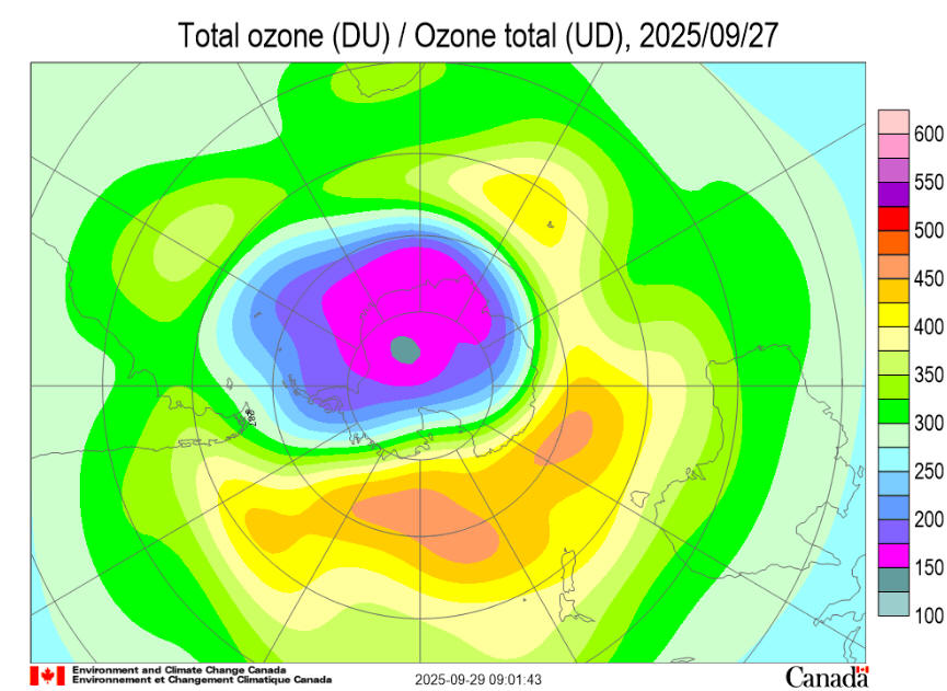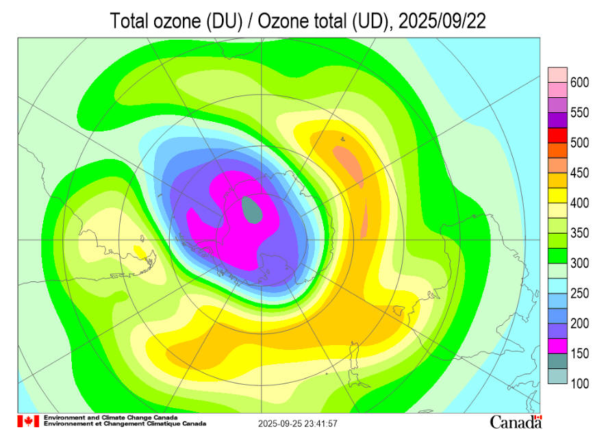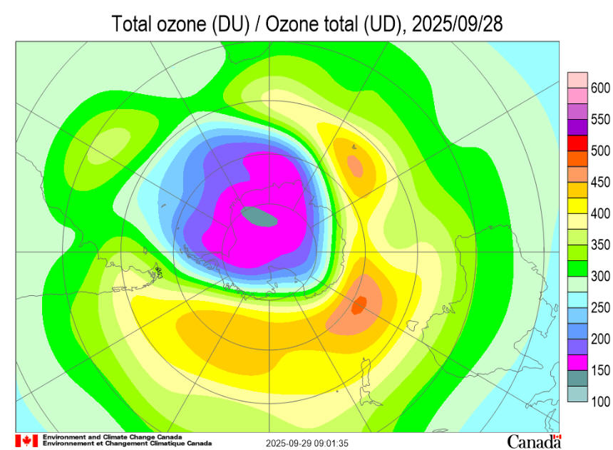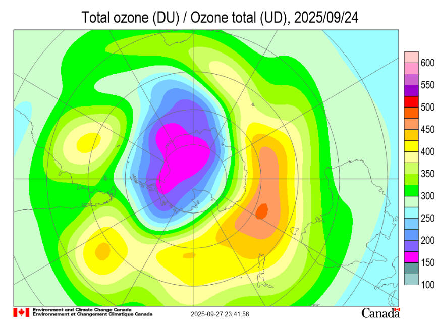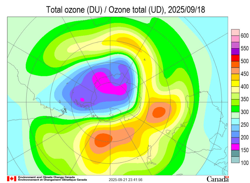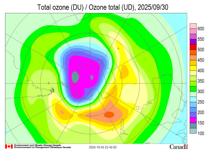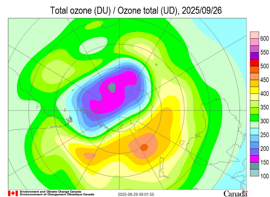 The total ozone maps are based on ground-based measurements available from the World Ozone and Ultraviolet Radiation Data Centre. Preliminary near real-time data from ground-based observations were also used for the most recent maps. Total ozone values are given in Dobson Units. The numbers represent observations taken from ground stations situated at the bottom left corner of the number. The World Ozone and Ultraviolet Radiation Data Centre (WOUDC) is one of six World Data Centres which are part of the Global Atmosphere Watch programme of the World Meteorological Organization. The WOUDC data centre is operated by the Meteorological Service of Canada, a branch of Environment and Climate Change Canada. Ozone data set categories include total column ozone and vertical profile data from lidar measurements, ozonesonde flights, and the Umkehr technique. Ultraviolet (UV) radiation data set categories include broadband, multiband, and high resolution spectral data types. Maps of deviations represent total ozone deviations from the 1978-1988 level estimated using Total Ozone Mapping Spectrometer (TOMS) data for all areas except the Antarctic and from the pre-1980 level estimated using Dobson data over the Antarctic. Over areas with poor data coverage adjustments are made according to TOMS on Nimbus-7, Meteor-3, ADEOS and Earth Probe satellites. Over the polar night area Dobson and Brewer moon observations and/or NOAA's TIROS Operational Vertical Sounder (TOVS) satellite data are used. TOVS data are also used when the more reliable TOMS data are not available. The mapping algorithm is similar to those used by the WMO Ozone Mapping Centre. |