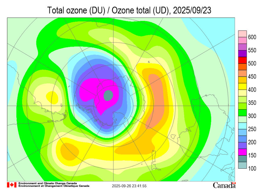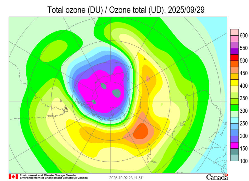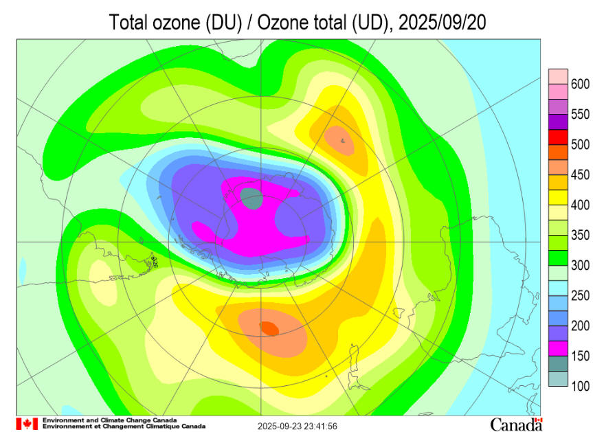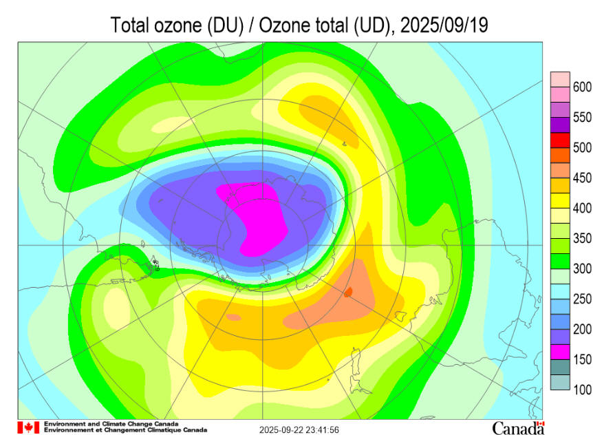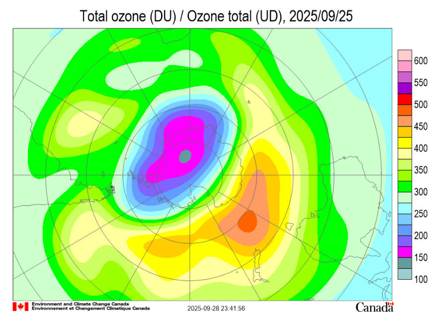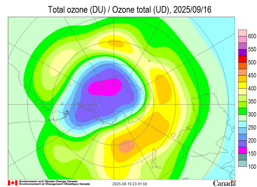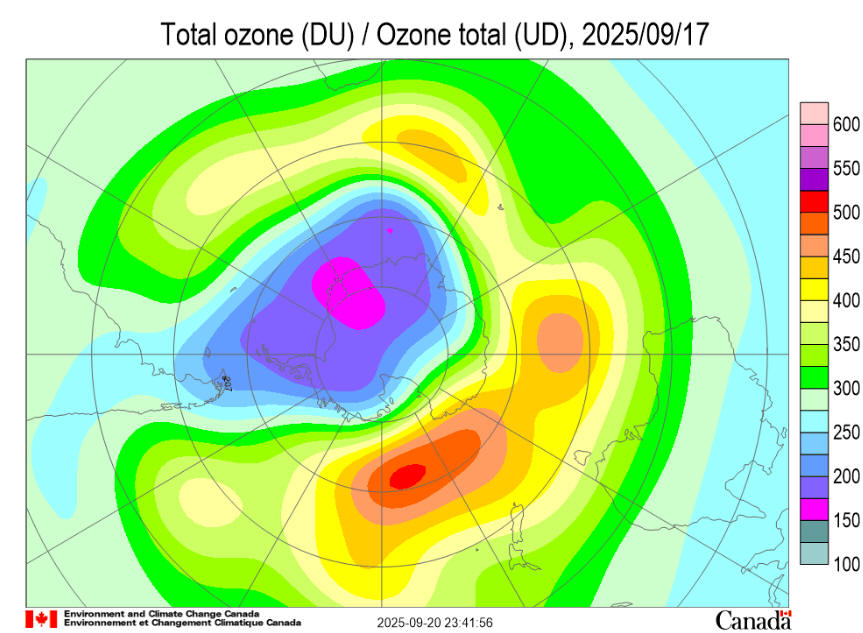 The total ozone maps are based on ground-based measurements available from the World Ozone and Ultraviolet Radiation Data Centre. Preliminary near real-time data from ground-based observations were also used for the most recent maps. Total ozone values are given in Dobson Units. The numbers represent observations taken from ground stations situated at the bottom left corner of the number. The World Ozone and Ultraviolet Radiation Data Centre (WOUDC) is one of six World Data Centres which are part of the Global Atmosphere Watch programme of the World Meteorological Organization. The WOUDC data centre is operated by the Meteorological Service of Canada, a branch of Environment and Climate Change Canada. Ozone data set categories include total column ozone and vertical profile data from lidar measurements, ozonesonde flights, and the Umkehr technique. Ultraviolet (UV) radiation data set categories include broadband, multiband, and high resolution spectral data types. Maps of deviations represent total ozone deviations from the 1978-1988 level estimated using Total Ozone Mapping Spectrometer (TOMS) data for all areas except the Antarctic and from the pre-1980 level estimated using Dobson data over the Antarctic. Over areas with poor data coverage adjustments are made according to TOMS on Nimbus-7, Meteor-3, ADEOS and Earth Probe satellites. Over the polar night area Dobson and Brewer moon observations and/or NOAA's TIROS Operational Vertical Sounder (TOVS) satellite data are used. TOVS data are also used when the more reliable TOMS data are not available. The mapping algorithm is similar to those used by the WMO Ozone Mapping Centre. |
